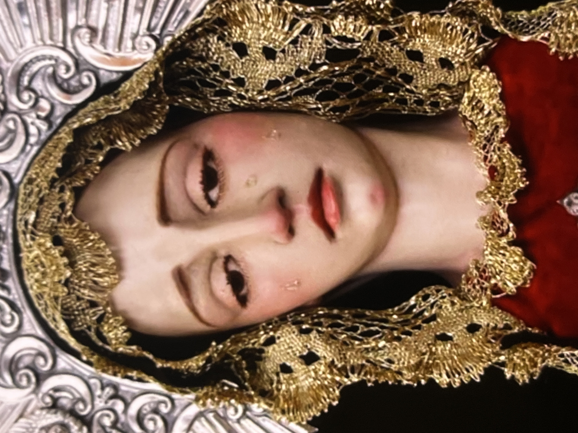 A close-up, waist-up depiction of a religious sculpture, specifically a Marian statue known as a Dolorosa, is presented