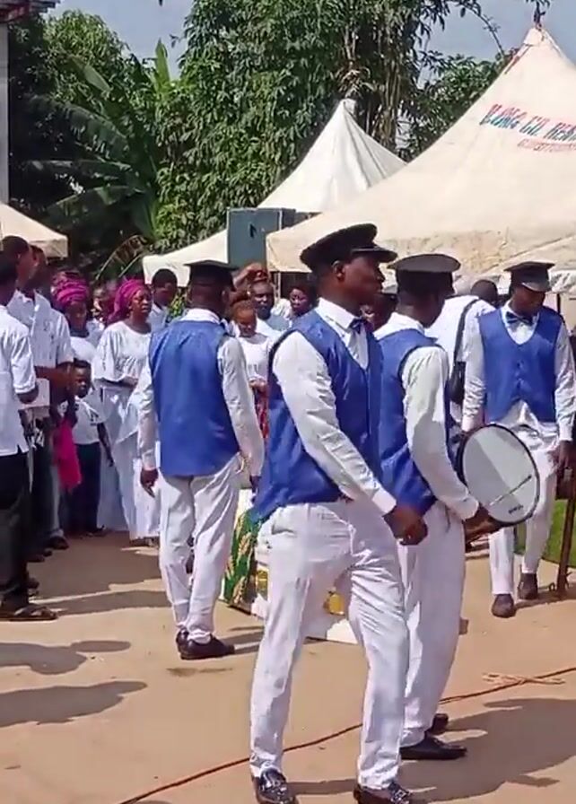 The scene captures a funeral procession moving down a dirt road. The central focus is a white and gold coffin carried by pallbearers. Mourners, many dressed in white, follow behind. Notably, a group of men in blue vests, white pants, and hats lead the procession, some playing drums and instruments. Tents provide temporary shelter along the road, and dense green trees form a natural backdrop to the solemn event. Some people can be seen taking photos.
