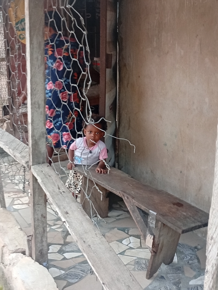 A young child stands in a semi-outdoor area in Umuode, Nigeria, looking directly forward through a loosely woven metal mesh barrier