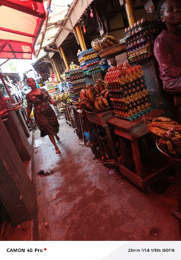 A bustling marketplace scene unfolds with vibrant displays of goods. Piled eggs in colorful cartons and bunches of bananas line small wooden tables. A barefoot woman walks through the center aisle. The space is dimly lit, casting a red hue over the concrete floor. A partial view of a person stands near the edge of the frame, adding to the lively atmosphere.