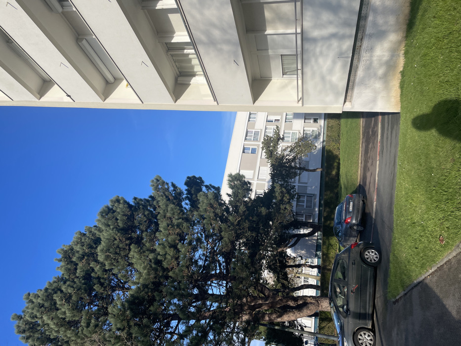 The image depicts an exterior urban residential scene in Caen, France, under a clear blue sky with direct sunlight. On the right, a segment of a multi-story apartment building with an off-white facade features multiple tiers of recessed windows or balconies. These openings are equipped with white frames and external roller shutters, some partially raised, others fully lowered. Distinct shadows are cast on the building's surface from direct solar illumination. On the left side of the frame, several large pine trees with dark green foliage dominate the mid-ground, partially obscuring a distant, multi-story residential building similar in design to the one on the right. Below the trees, two vehicles are parked on an asphalt surface: a dark grey hatchback, which exhibits a red marking on its rear driver's side door, and behind it, a dark grey sedan with a partially visible French registration plate displaying "EC 60...". The foreground consists of green lawn sections and a paved edge. A prominent, elongated dark shadow, consistent with that of a standing person, is cast onto the grass in the lower right quadrant of the image. No individuals are visible, and no actions or interactions are occurring.