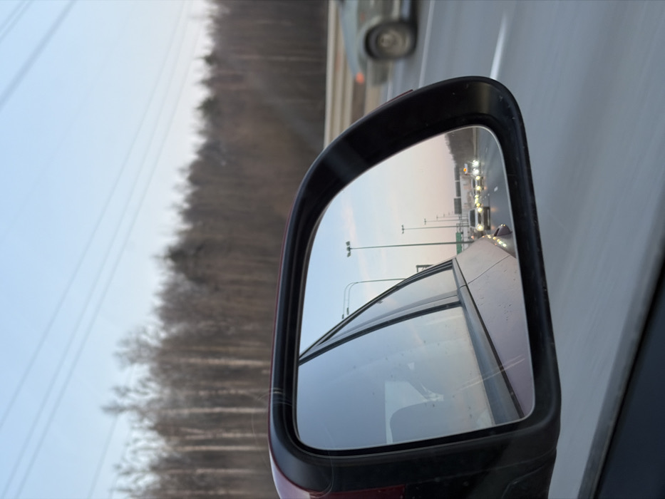 The image displays a roadside scene in Novosaratovka, Russia, captured from the perspective of a moving vehicle. The primary subject is the maroon-colored left-side rearview mirror of the vehicle taking the photograph, positioned in the lower-left to mid-right foreground. The mirror's casing exhibits minor scuffs. The mirror's reflection shows a multi-lane highway extending into the distance, populated by several vehicles with their headlights illuminated, traveling in the same direction as the observer. Overhead streetlights on tall poles are visible along the road. The reflected sky transitions from light blue at the top to a soft pinkish-orange near the horizon, indicative of dawn or dusk. Outside the mirror, in the mid-ground right, a light-colored vehicle, possibly gray or silver, is partially visible and blurred, suggesting motion as it passes or is being passed. Its rear wheel and side body are discernible. The road surface, appearing as asphalt or concrete, occupies the lower right and mid-ground. The background features a dense line of leafless deciduous trees, forming a forest or wooded area under a clear, pale blue sky. Multiple overhead power lines span across the upper portion of the sky. No individuals are directly visible.