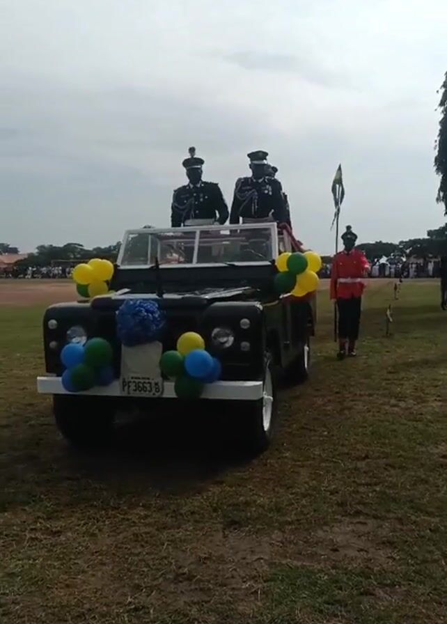A black Land Rover, decorated with yellow, green, and blue balloons, stands in a field. Two men in police uniforms, complete with hats, are standing in the vehicle. A third man in a red uniform walks alongside the vehicle, carrying a flag. The Land Rover's license plate reads "PF3663B". In the background, a crowd of people can be seen, and the sky is overcast. The Land Rover appears to be part of a ceremony or parade.
