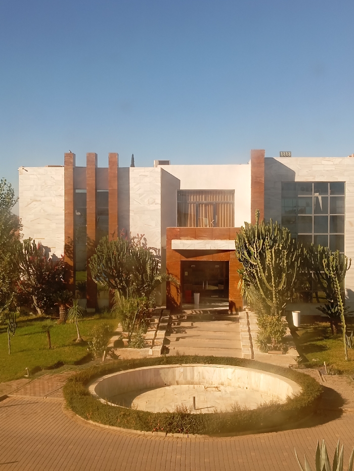 - "The image displays the exterior of a modern building in Majjate, Morocco, under a clear blue sky" by FM-Kfmej2, licensed under CC BY 4.0