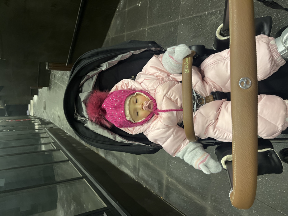 - "A baby, bundled in a pink snowsuit and a matching hat with a fur pom-pom, rests in a stroller" by FM-v5Wx12, licensed under CC BY 4.0