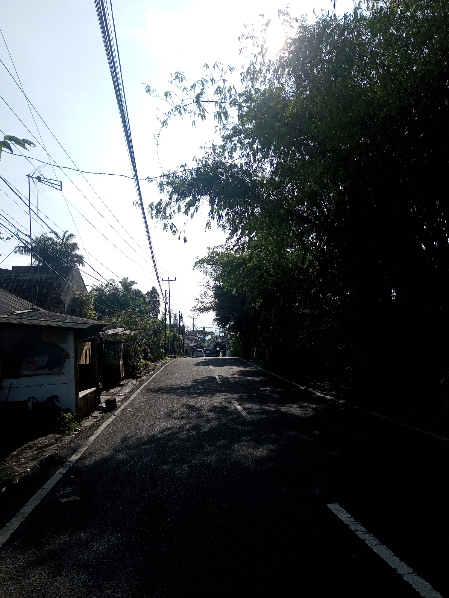 A street in Nhot Chang, Laos is depicted. The road is asphalt, marked with white lines on the edges, and it extends into the distance. The left side of the street has a row of buildings, and telephone or electric wires run above them. On the right side of the road is a dense cluster of trees, creating a partially shaded area. In the distance, some vehicles and figures are visible on the road. The sky is bright with the sun partially obscured by the foliage.