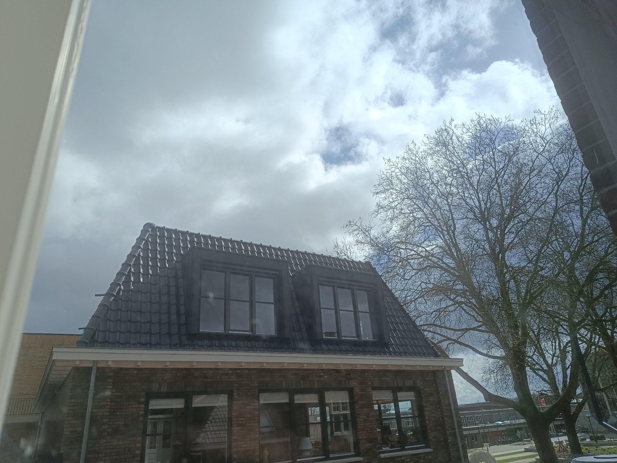 The image captures an exterior view of a building in Zevenaar, Netherlands, seen from an interior perspective through a window, with a prominent white frame visible on the far left