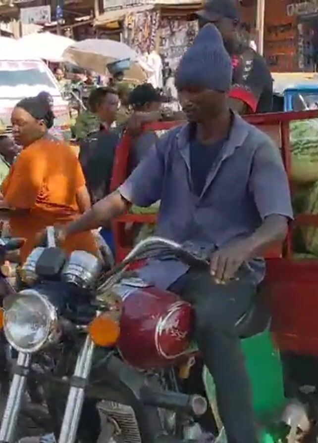 The video captures a bustling outdoor market scene, focusing on a motorcycle with a red trailer filled with watermelons. A man wearing a gray beanie and a blue shirt is driving the motorcycle, navigating through the crowd. Another man in a black sports jersey with the number 12 stands beside the trailer, seemingly assisting. The market is crowded with people shopping and walking around. Various stalls display fruits, vegetables, and other goods under umbrellas and tents. Several other motorcycles and a van are visible in the background. The environment appears lively, with a mix of vendors, shoppers, and passing vehicles.