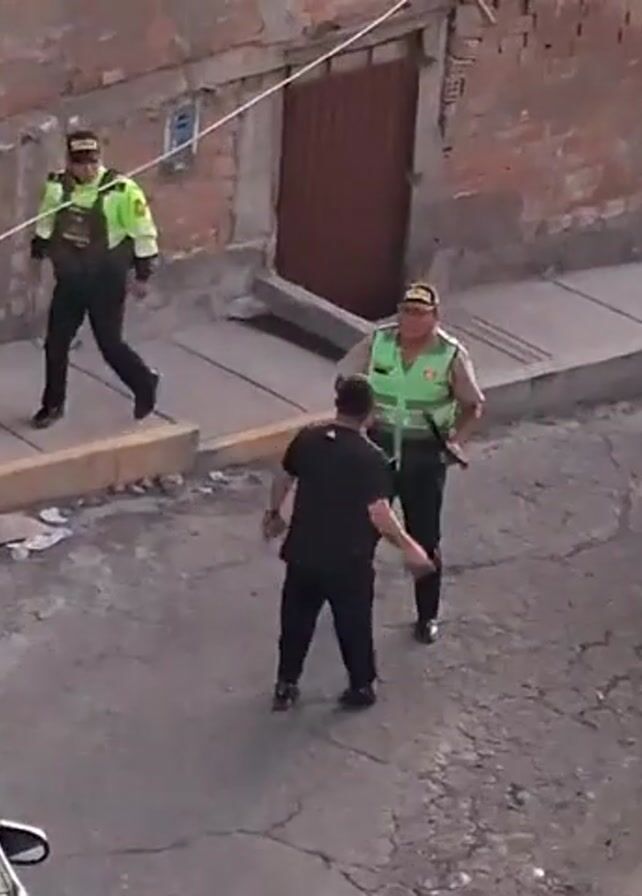 n overhead view of a street with a man in a black shirt and pants being chased by two uniformed officers. One officer is close behind, carrying a baton. Another officer is further back to the left. The man being chased has his arms out to the sides and appears to be shouting. A silver taxi with a roof sign is parked on the left side of the frame, and another vehicle is parked on the right. The buildings are brick and concrete, with a door visible behind the man and officers. A thin white line is strung across the street above.