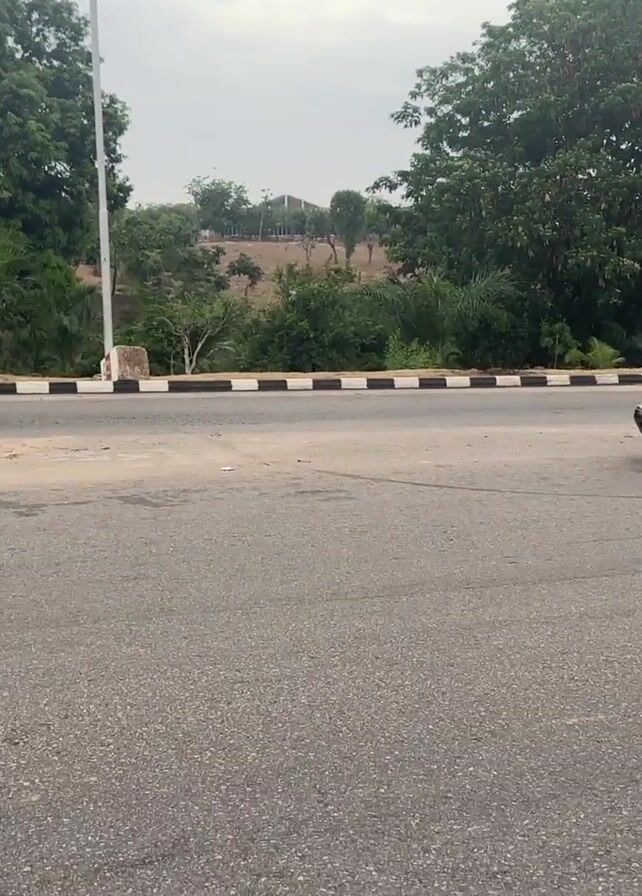 street scene with cars passing by. A silver SUV goes by on the left side of the screen. A black Mercedes sedan travels across the screen and makes a right turn. Then a gold Toyota Corolla travels in the same direction as the SUV and a blue car goes past the camera. In the background, there are trees and bushes lining the street. There's a small structure visible amongst the trees, likely a small building or hut. The road is paved with black and white painted road dividers.