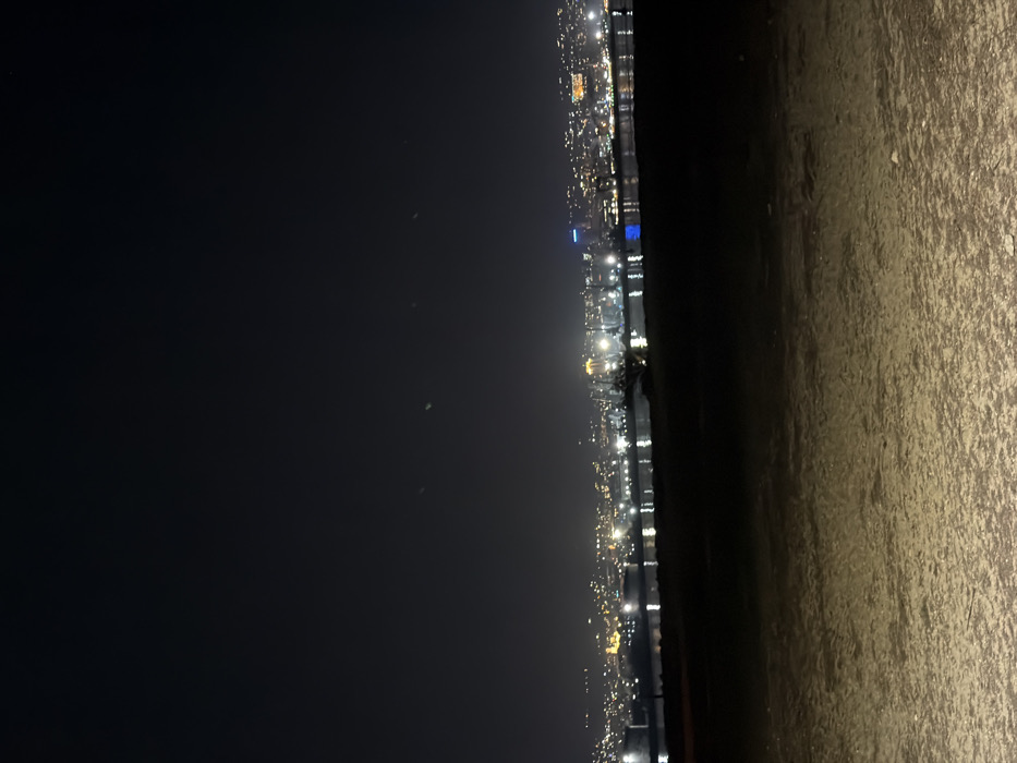 The image presents a panoramic nighttime view of the city of Varna, Bulgaria, specifically looking across the Bay of Varna or Varna Lake towards the city center and port. The foreground consists of a dark, uneven expanse of sandy or earthy terrain, devoid of identifiable objects or individuals. Immediately beyond the foreground lies a body of water, reflecting numerous city lights. Multiple vessels, including what appear to be cargo ships or industrial boats, are docked or present near the far shoreline. The midground and background comprise the urban sprawl of Varna, illuminated by a multitude of artificial lights from buildings, streets, and other infrastructure. A prominent golden-domed structure, consistent with the Dormition of the Theotokos Cathedral, is visible as a distinct illuminated point in the left-center portion of the city skyline. Towards the right-center, a taller building exhibits blue lighting. The sky above is dark and clear, showing no celestial bodies of note. The scene is static, devoid of discernible human activity or interactions.