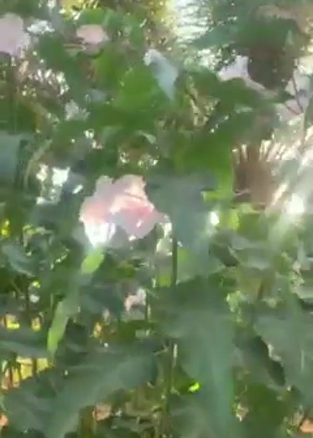 - "plant with large green leaves and light pink flowers, backlit by the sun, obscuring the image with bright light" by FM-hWfhv1, licensed under CC BY 4.0