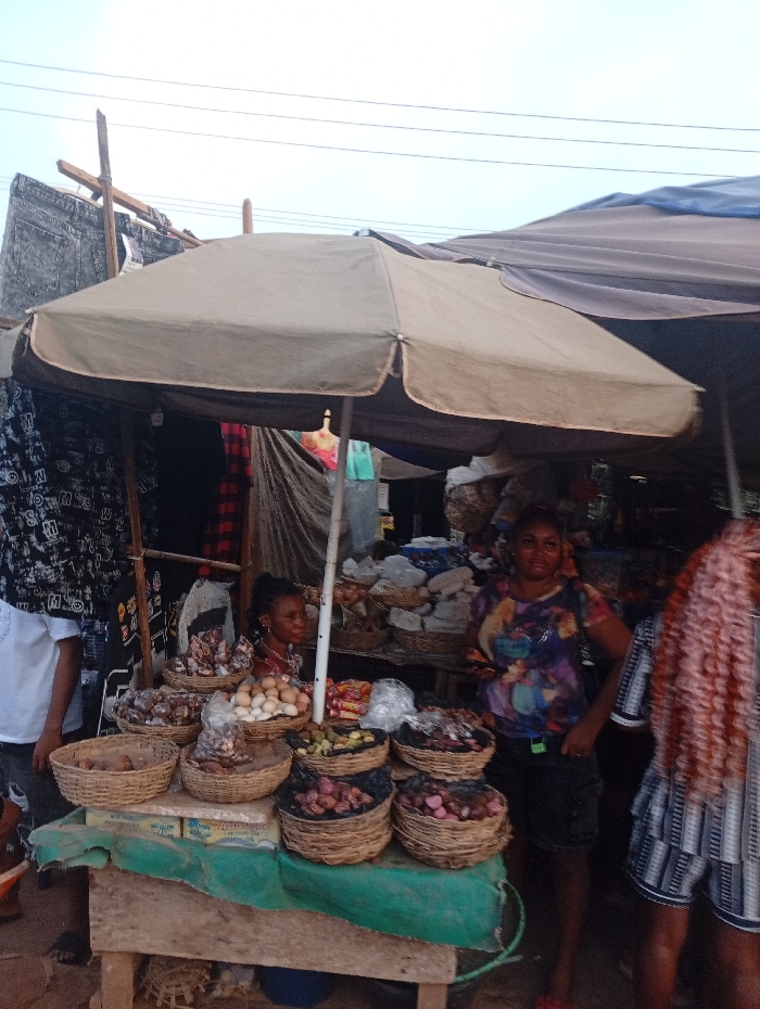 A market scene under a large umbrella with two women. One woman is behind a wooden table piled with woven baskets containing produce such as potatoes, eggs, and various other fruits or vegetables. The other woman stands to the side of the table with her hand on her hip. Other items and fabrics hang on the structures surrounding the stall. A person with long, curly red hair partially obscures the right side of the view.