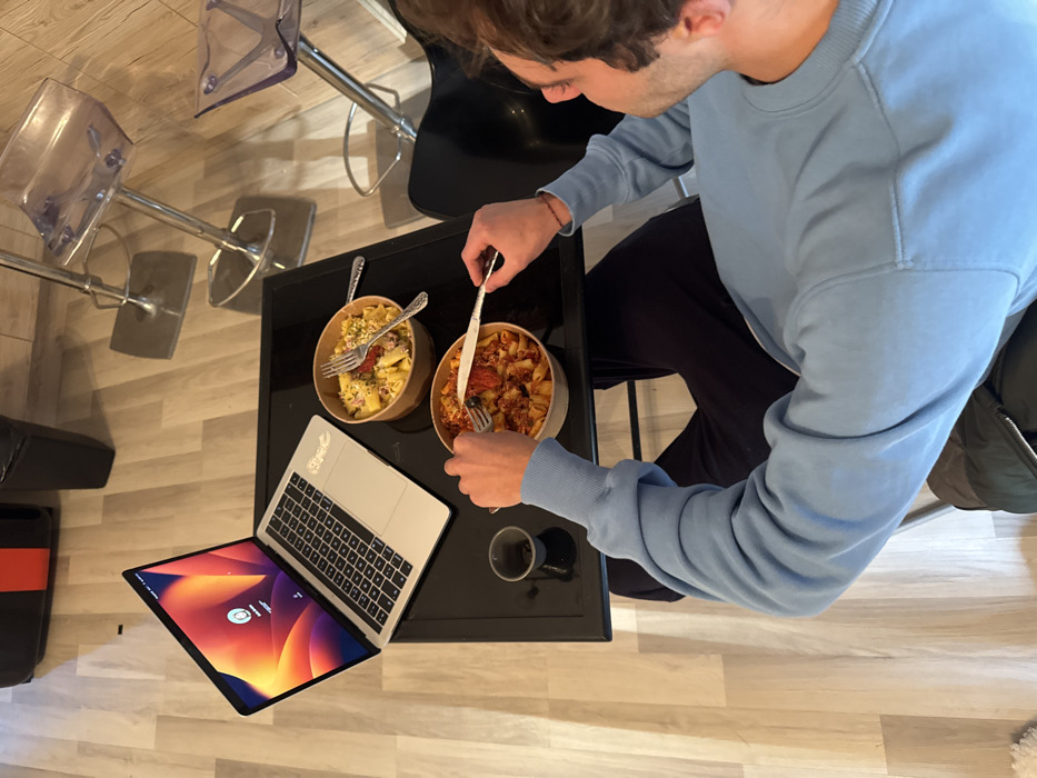This image provides an overhead view of an indoor setting. A male individual, seen from the upper back and right side, is seated at a black, reflective rectangular table. He wears a light blue long-sleeved sweatshirt and dark trousers, and has short brown hair with light facial stubble. A thin dark bracelet is visible on his right wrist. He is actively eating from a round, light brown disposable bowl containing red-sauce pasta, holding a silver fork in his left hand and a silver knife in his right. To the left of the individual, a silver MacBook laptop is open on the table, displaying a colorful login screen with a user profile icon. A small white sticker is affixed to the laptop's palm rest. Another identical round, light brown disposable bowl of pasta, containing a lighter-colored dish with green and red garnishes, is positioned further on the table, with a silver fork resting inside it. A small, dark cup or glass is also present on the table, positioned between the laptop and the eating individual's hands. The floor is covered in light-toned, wood-effect planks. In the background, to the left, a dark object featuring a red stripe is partially visible. To the right, two bar stools with clear plastic seats and chrome bases are present. The specific location within the city of Villeurbanne, France, is not discernible from the visual information provided.