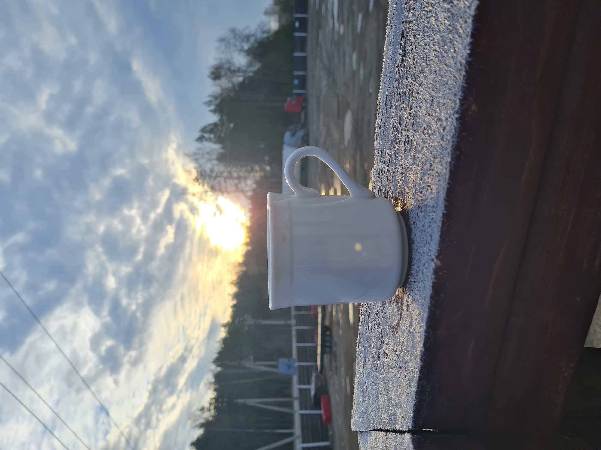 A white mug sits on a frost-covered wooden surface. The background shows a cloudy sky with the sun shining through. Beyond the wooden surface is a partially visible area with trees and what appears to be some infrastructure, possibly a parking lot. The scene is outside, and the frost suggests a cold temperature. The location of the image is in Noviy, Russia.