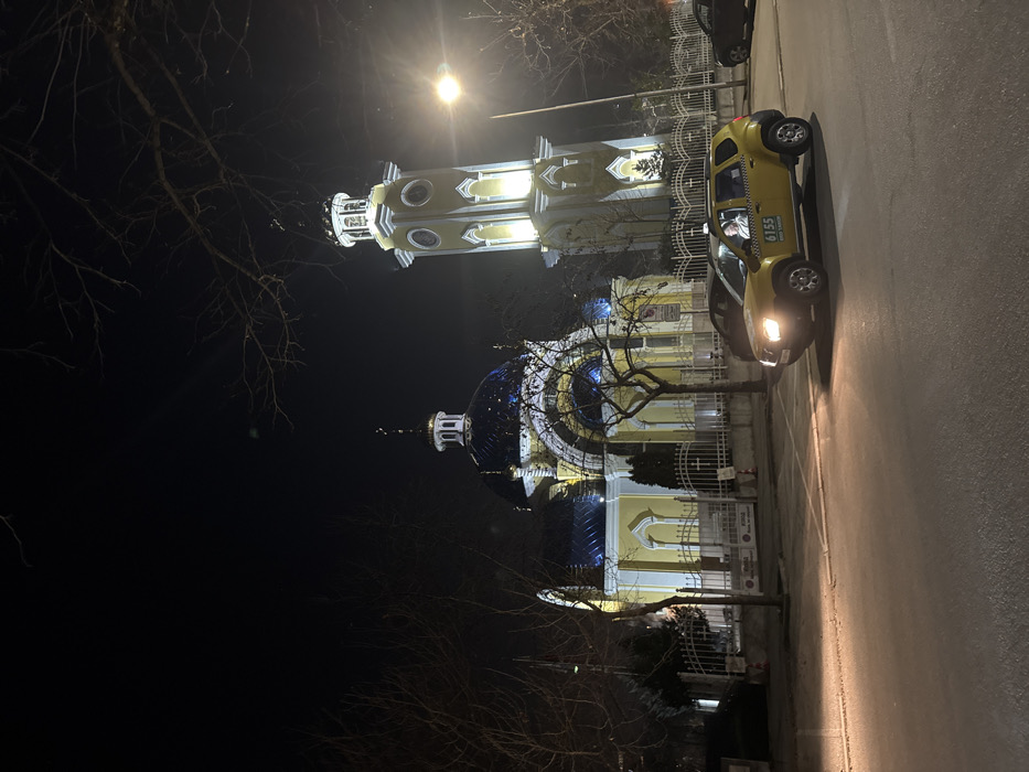 The image depicts a nighttime street view of the St. Constantine and Helena Church and its bell tower in Plovdiv, Bulgaria. The church, positioned on the left, features a yellow facade with intricate architectural elements and dark blue domes topped with golden finials, all illuminated. To its right stands a tall, slender yellow bell tower with clock faces, also brightly lit. In the mid-ground, a yellow Dacia Duster taxi, bearing the words "БОРБА TAXI" and the number "6155," is visible on a paved road with its headlights on. A male driver is discernible inside the vehicle. Bare tree branches are visible against the dark sky and around the structures. A white ornate metal fence delineates the church grounds from the street, and a streetlight provides overhead illumination. Other parked vehicles are partially visible in the background.