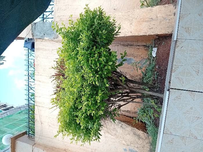The scene depicts an outdoor residential or commercial area in Embu, Kenya, during daytime. In the foreground, a beige tiled surface with geometric patterns borders a patch of dark brown soil via a metal trim. A multi-stemmed, bushy green shrub with dense foliage is centered in the soil patch, surrounded by smaller green ground cover. Behind the shrub is a textured, weathered beige wall, possibly stucco or painted concrete, showing discoloration. Mounted atop this wall is a black wrought-iron fence with decorative scrollwork. A white spherical light fixture rests on a concrete post on the wall's left side. A dark, irregularly shaped object, possibly rubber, is situated on the wall behind the fence on the right. In the background, above the wall and fence, a multi-story building under construction is visible, partially enveloped by green scaffolding netting. The sky is clear blue with minimal cloud cover. A dark, draped fabric or tarp is partially visible in the upper right corner of the frame. No individuals are present.