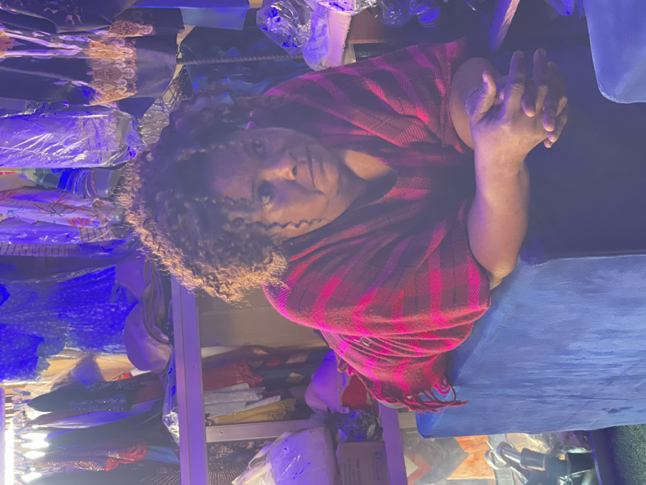 An adult female, with curly dark hair and a pensive expression, is situated prone on a blue upholstered surface, likely a bench or display, with her upper body supported by her forearms and hands clasped. She is wearing a red and black plaid poncho-style garment with fringed edges. The setting is identified as a retail clothing establishment in Samaru, Nigeria. The background reveals multiple white shelving units and clothing racks containing various garments, many enclosed in clear plastic bags, indicating merchandise. Specific items include patterned fabrics, dresses, and a beige brassiere on a shelf. Artificial illumination casts a distinct blue-purple hue across the scene, particularly noticeable in the upper background. A section of green artificial turf is visible on the floor in the lower-left foreground.