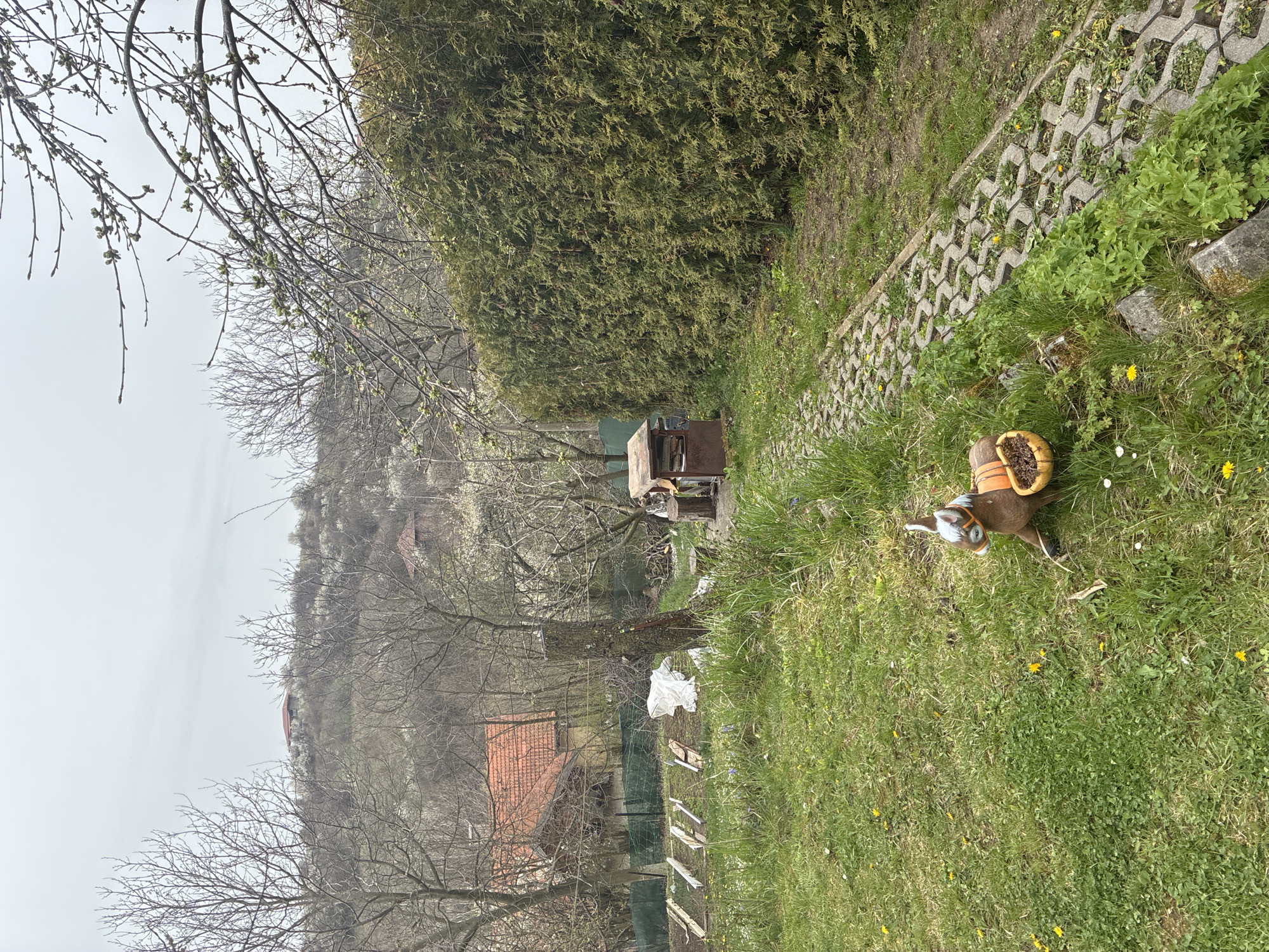 The scene is a garden in Lyulin, Bulgaria, captured on a day with overcast skies. The garden features a mix of maintained and wild growth. There's a stretch of green grass scattered with dandelions and daisies. Near the edge of the frame, there's a decorative ceramic donkey pulling a small cart filled with material, likely soil or fertilizer. A concrete block retaining wall, partially covered with vegetation, runs parallel to the grass. A tall, dense hedge lines the background, offering a backdrop to the central garden area. Further into the background, a grill or outdoor cooking area stands beneath bare trees. In the distance, houses with red tiled roofs are nestled among the hills, suggesting the garden is on a slope overlooking a residential area. The overall impression is of a well-kept but natural garden setting within the urban landscape of Lyulin.