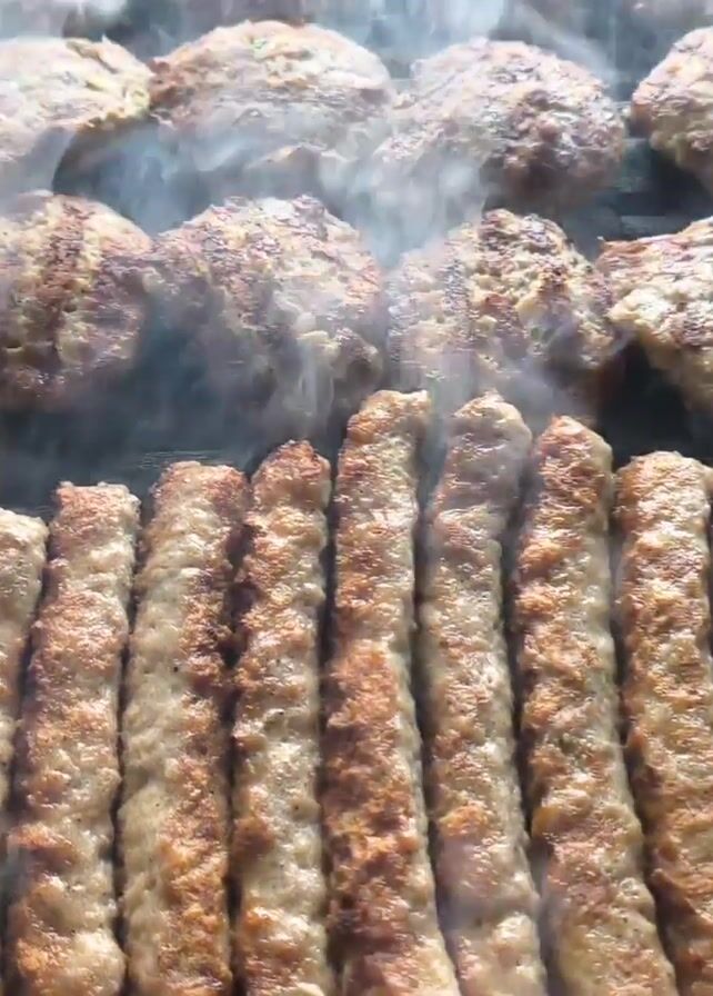 grill with rows of meat patties and cevapcici, cooking over heat and covered in smoke
