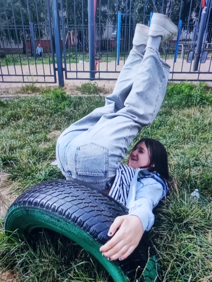 - "The image captures a young female lying on her back on a grassy patch in Bulamikcha, Uzbekistan, her legs raised vertically and bent at the hips, positioned over a dark rubber car tire with a green-painted sidewall" by FM-1o2DD3, licensed under CC BY 4.0