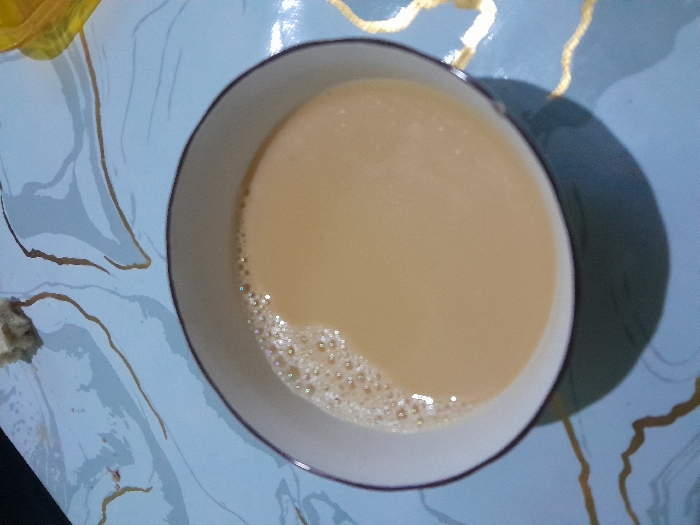 A white bowl filled with light tan liquid, possibly tea or coffee with milk, sits on a marbled blue and white surface