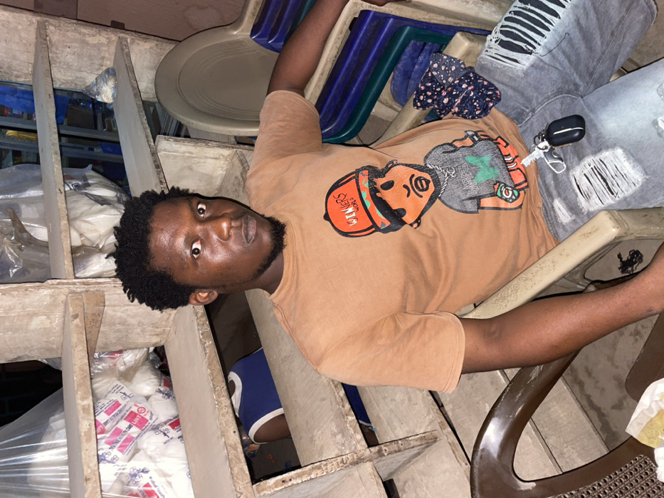 A person wearing an orange t-shirt with a cartoon on it is lying down among several chairs. The person is looking at the camera with a serious expression. The person is wearing ripped jeans. Behind them are shelves filled with packages. The shelves and surrounding area are cluttered.