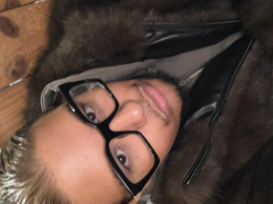 A close-up portrait depicts one adult individual, an adult male with a dark complexion, looking directly into the camera. He has short, styled dark hair with lighter highlights, a short beard, and is wearing large, black, thick-rimmed eyeglasses. His lips are slightly parted. He is dressed in a dark brown fur or faux fur coat, layered over a black leather garment with a visible zipper. A grey hooded sweatshirt is visible beneath the coat, with the hood positioned around his neck. A small, light-colored earring is visible in his left ear. The background consists of light brown wooden panels with visible grain and vertical seams, indicating an indoor setting. The specific location in Paris, France, is not discernible from the image.