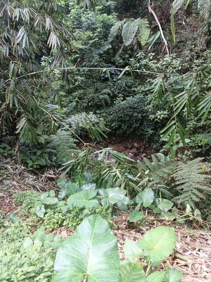The image displays a dense, verdant natural environment located in Butwal, Nepal. The scene is dominated by various plant species under diffused lighting. In the foreground, several large, green, heart-shaped leaves, consistent with taro plants, are prominent, along with areas of smaller green vegetation and scattered dry, straw-like foliage on the ground to the lower left. The midground and background consist of a thick, multi-layered canopy of foliage, primarily featuring numerous bamboo stalks and branches with slender green leaves, interspersed with various ferns displaying segmented fronds. A narrow, muddy depression or dry stream bed, characterized by exposed brown soil and scattered rocks, is visible in the central-right portion of the image, partially obscured by low-hanging vegetation. The background rises steeply, covered in a dense array of dark green shrubs and trees. No individuals, animals, or manufactured objects are present.
