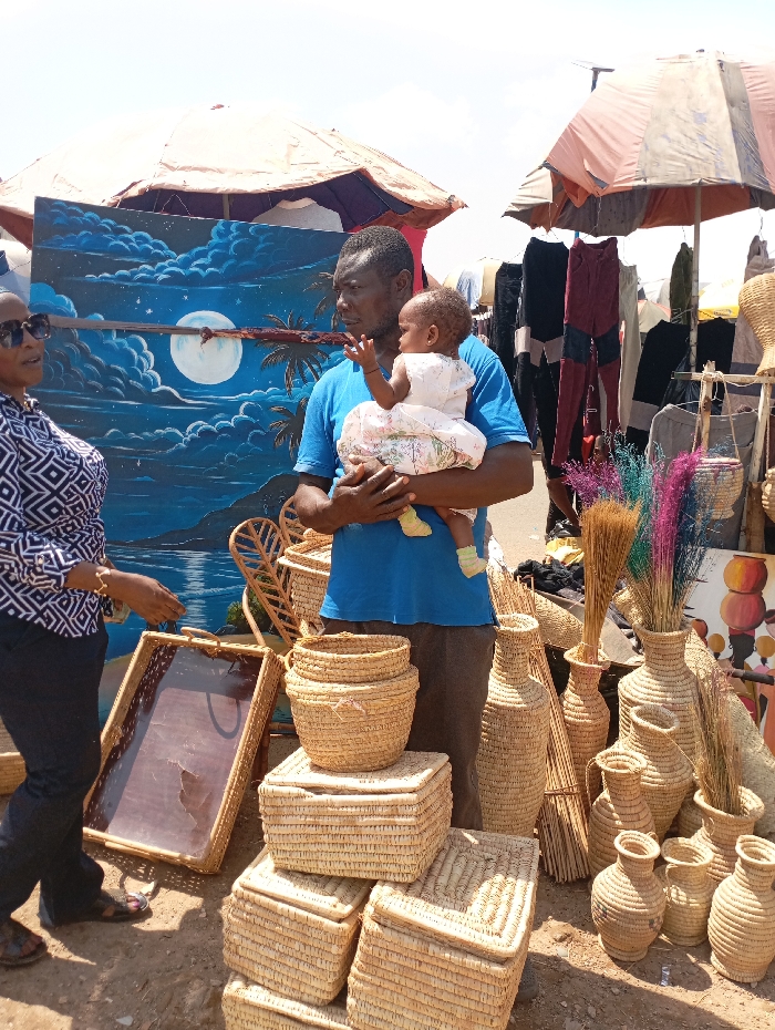 An outdoor market scene in Nyanya, Nigeria, captured during daylight under a bright sky. In the center, a man in a blue t-shirt and dark trousers holds an infant dressed in a white floral pattern dress. The man looks towards the right, while the infant faces left with its right arm partially raised. To the left, a woman wearing a black and white patterned top, dark trousers, and sunglasses gestures with her right hand towards the man or the displayed merchandise. Behind the man and infant, a large blue painting depicting a full moon, clouds, and palm trees is visible. In the foreground and extending to the right, a significant collection of woven straw items is displayed on the ground. These include multiple lidded rectangular baskets stacked in tiers, various sizes of rounded and cylindrical baskets, and numerous straw vases of different heights and designs. Some vases contain bundles of thin, natural fiber sticks, a few with colorful tips. To the left foreground, a large rectangular woven tray with a broken glass top rests on the ground. The market environment includes a dirt ground, and in the background, large sun umbrellas provide shade over other market stalls where clothing items are visible hanging.