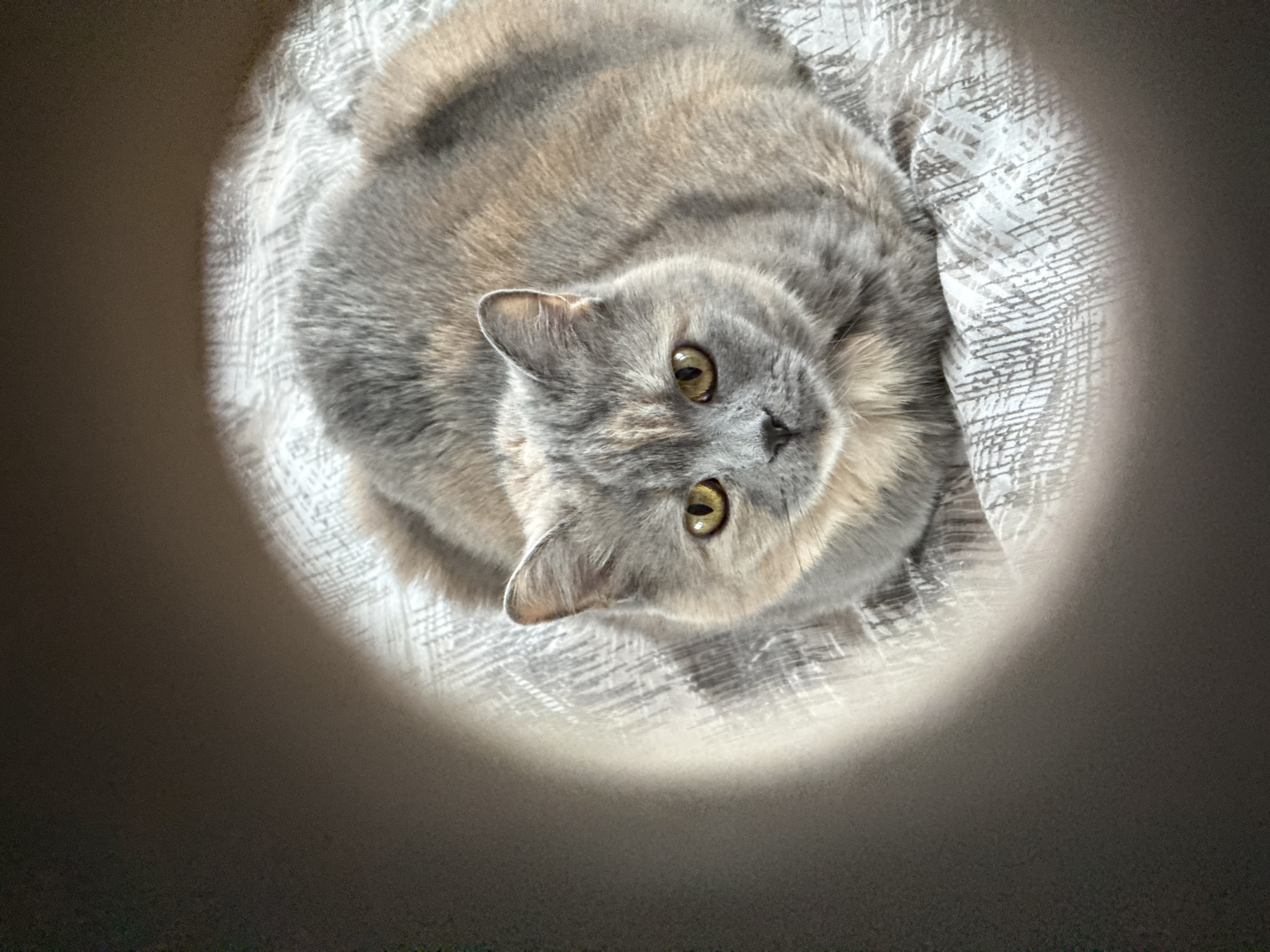 A dilute tortoiseshell cat, exhibiting a mottled grey-blue and cream-peach fur pattern, is positioned centrally within a circular vignette. The feline has prominent amber-yellow eyes and is looking directly forward, appearing to be in a relaxed, loaf-like posture with paws tucked beneath its body. It rests upon a light-colored fabric surface adorned with a repeating, subtly textured, geometric pattern. The area surrounding the circular frame is dark and indistinct. The scene is located in Sofia, Bulgaria.