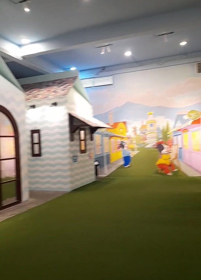 n indoor play area designed to resemble a town. The "town" features small, house-like structures with painted facades. One building is labeled "COWBANK". The floor is covered in artificial grass with tiled walkways. A mural of a landscape with mountains and buildings is painted on the back wall. The lighting is bright, with several ceiling lights illuminating the area. There are no people visible in the video.