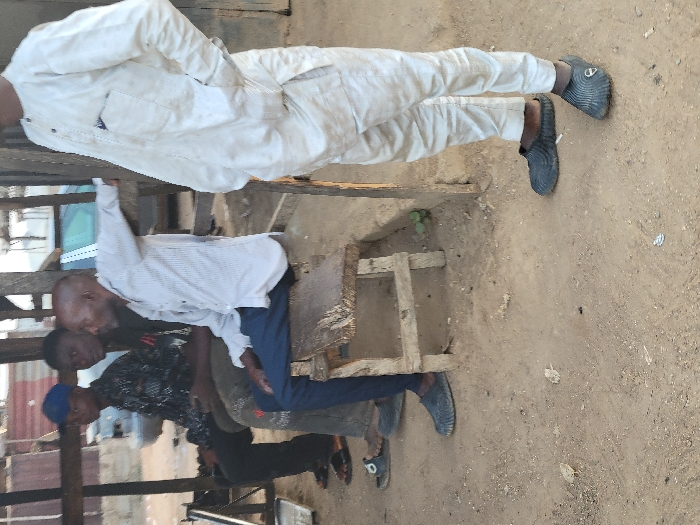 Three men are gathered outside. One man wears a light-colored, possibly white, outfit and dark slip-on shoes. Another man wears a light shirt and dark pants and is sitting on a rough, wooden structure, likely a bench or table. A third man, wearing a dark patterned shirt and a blue cap, stands near the seated man. The setting appears to be a simple outdoor area with dirt and a few structures visible in the background.