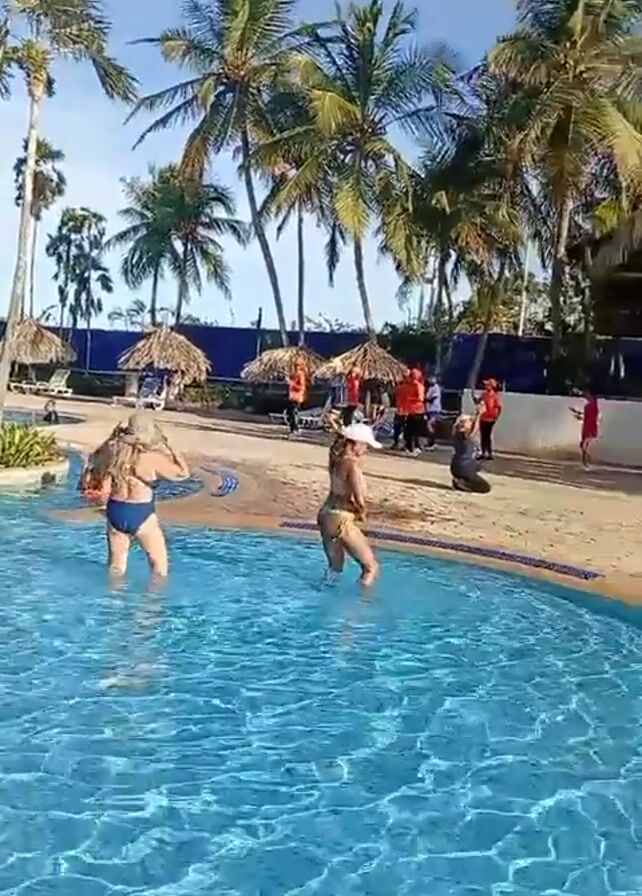 bright, sunny scene at an outdoor pool. Two women in bikinis are wading in the shallow water, dancing and raising their arms to music. Several palm trees surround the pool. In the background, a group of people, some wearing red shirts, are standing on the pool deck. There are some straw umbrellas and lounge chairs on the side of the pool. A person is sitting on the ground, seemingly taking a video of the people on the deck. The water is blue, and the overall scene suggests a tropical vacation.