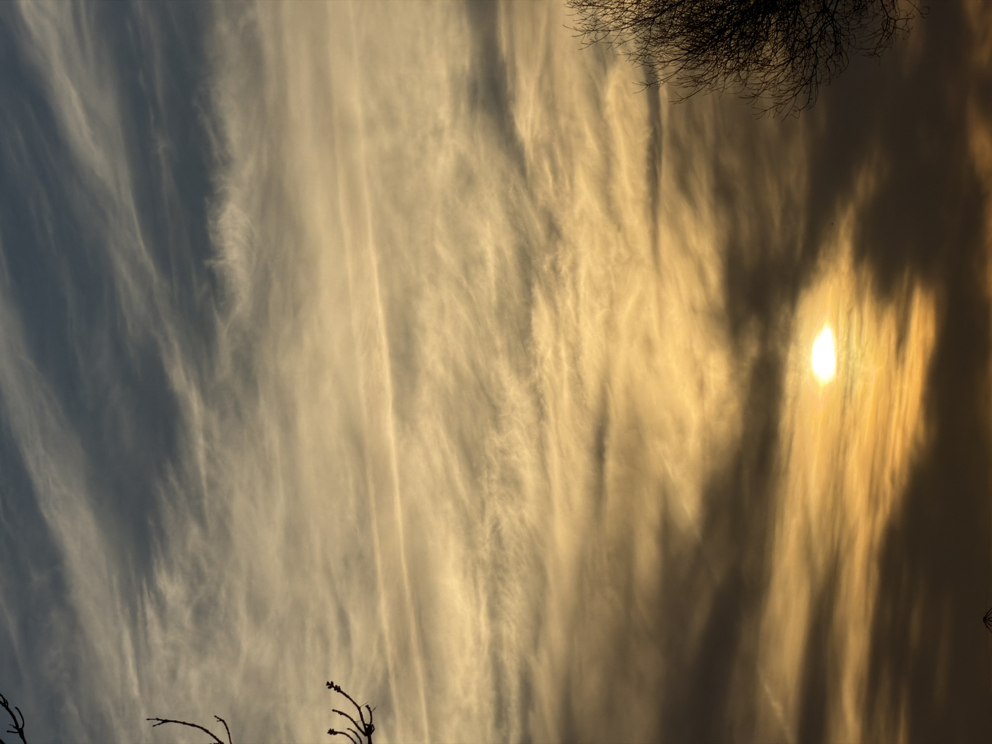 view of the sky, likely taken in Pentre, United Kingdom. Cirrus clouds stretch across the frame, illuminated by the setting sun, which is visible as a bright orb partly obscured by the clouds. Bare tree branches are silhouetted in the top right corner and bottom edge of the image. The sky transitions from a pale blue-grey on the left to a golden hue near the sun.