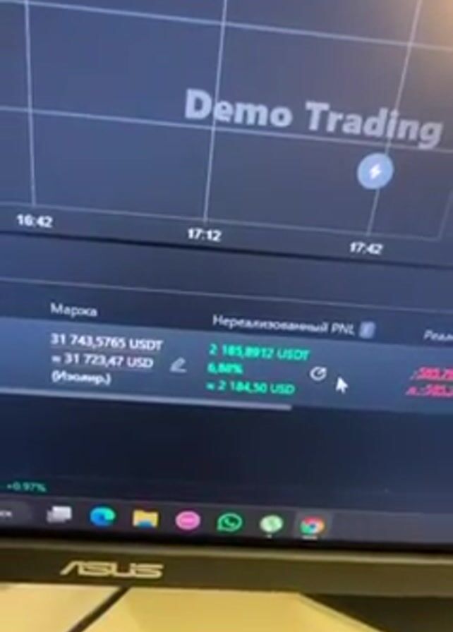 computer screen displaying a Demo Trading platform. The screen shows a real-time graph of cryptocurrency prices with time markers. Below the graph are figures labeled "Margin," "Unrealized PNL," and "Realized PNL," all displayed in USDT. The Unrealized PNL fluctuates between approximately 2100 and 2300 USDT, with percentages shown beside it. The computer is an Asus brand, and several app icons are visible on the taskbar including WhatsApp, Telegram, and Google Chrome. The table beneath the monitor has a light tan color.