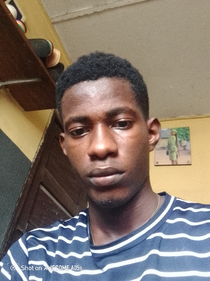 The image presents a male individual indoors in the city of Onitsha, Nigeria