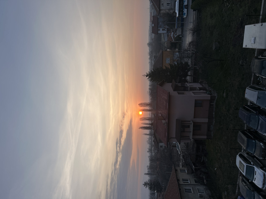 An elevated wide-angle shot depicts a residential area in Sofia, Bulgaria, during sunset. The sky displays a gradient from light blue-grey overhead to vivid orange and red hues at the horizon, with thin, scattered cloud formations. The sun, a bright orange-red disk, is low on the horizon, positioned slightly left of center, partially silhouetted by a line of five tall, bare deciduous trees. In the foreground, a paved parking area contains a row of nine parked vehicles, including multiple dark-colored SUVs, a silver BMW SUV, and a white recreational vehicle or trailer to the far right. Immediately beyond the parking area is an unkempt grassy plot with sparse vegetation and bare tree branches. The mid-ground is dominated by residential structures. A two-story, light peach-colored house with a red-tiled hip roof and two dark-colored balconies is central, facing away from the viewer. To its left, a portion of another two-story building with a red-tiled roof is visible. Further into the mid-ground, a paved street runs horizontally. A white and blue city bus is visible on this street, moving leftward. One individual is discernible walking on the sidewalk near the bus. Several other houses with red-tiled roofs are scattered throughout the mid-ground and background, alongside additional bare deciduous trees and a notable evergreen conifer. The distant background appears hazy, with a faint horizon line suggesting a broader urban or natural landscape under the fading light. No specific interactions or significant actions are clearly observed among the depicted elements.