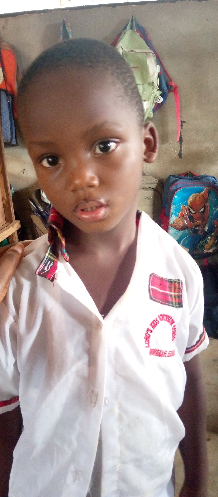 A young child with dark skin and short, dark hair is depicted in a head-and-shoulders portrait, looking directly forward. The child wears a white, short-sleeved collared shirt with a red, green, black, and white plaid pattern on the collar and right chest pocket. Below the pocket, red embroidery reads "LORD'S KIDS MONTESSORI SCHOOL" and "UKWUE GBWA". A dark-skinned hand rests on the child's left shoulder. The background is an indoor light brown wall, against which multiple backpacks are visible: a partially seen orange and blue bag on the left, a green and blue bag in the upper-middle, and a blue backpack featuring a large Spider-Man graphic on the right. A wooden structure is partially visible on the far left. The scene is located at Lord's Kids Montessori School in Ukwu-Abwa, Nigeria.