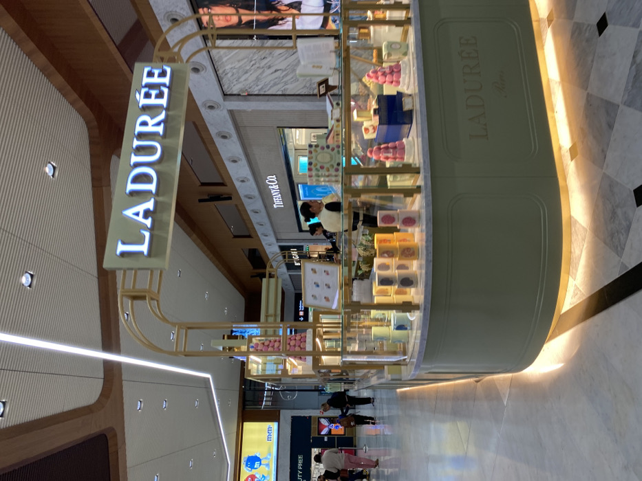 This image captures a brightly lit indoor scene within a modern airport terminal, located in Le Mesnil-Amelot, France, likely Charles de Gaulle Airport. The central subject is a Ladurée confectionery kiosk, characterized by its pale green lower panel with "LADURÉE Paris" embossed, a white marble countertop, and a gold-toned metallic framework supporting glass display cases. An illuminated "LADURÉE" sign hangs prominently above the kiosk. Within the glass display cases, multiple pink macaron pyramids and various pastel-colored packaged confections are arranged. Two individuals, appearing to be staff, are visible behind the counter, with one partially obscured. The environment features a polished light-colored tiled floor with darker linear and checkerboard patterns, illuminated at the base of the kiosk by linear LED strip lighting. The high ceiling is modern, with white panels, numerous recessed spotlights, and long linear LED lights, complemented by wooden architectural accents. To the right of the kiosk, storefronts for "Tiffany & Co." and "Bvlgari" (partially visible) are present, along with a large digital display or poster featuring a woman's face. To the left, a "Duty Free" sign and a large digital screen displaying M&M's characters are discernible. Several pedestrians are observed walking in the background, traversing the concourse. The overall lighting is uniform and artificial, indicative of a commercial, high-traffic indoor setting.