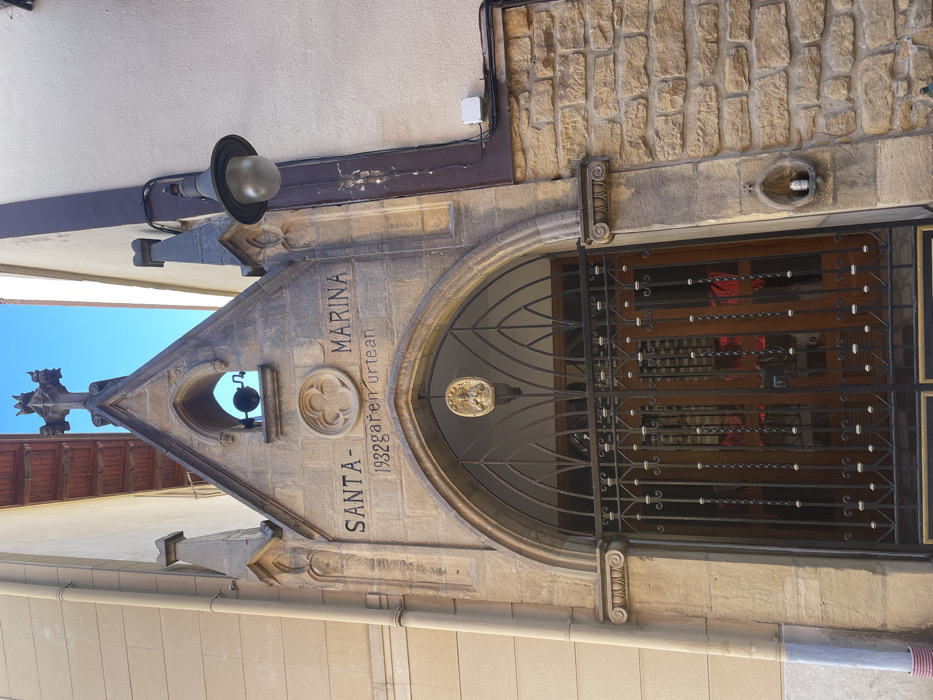 A forensic description of the image reveals the entrance of a stone-built structure identified as the Santa Marina chapel or hermitage, located in Zarautz, Spain. The facade features a pointed archway leading to a brown wooden door, obscured by an ornate black wrought-iron gate with gold-colored decorative elements. Above the gate, a golden, circular emblem depicting a figure (possibly a bust) is suspended. Carved into the stone lintel above the arch are the words "SANTA-MARINA" and below it, "1932GARen URTEAN," indicating "in the year 1932." Above these inscriptions, a quatrefoil-like stone carving is centered, with a small bell suspended in an open archway above it. The structure culminates in a stone cross at its apex, flanked by decorative pinnacles. To the left of the entrance is a smooth, light-colored building with a vertical grey downspout. To the right, a building with a beige stucco upper section and a rough-hewn stone lower section is visible. A black, conical street lamp with a clear glass globe extends from the right building's facade. Below this lamp, a small, shell-shaped stone niche is affixed to the stone wall, containing a silver-colored beverage can. The upper portion of a wooden balcony is visible between the buildings, against a clear blue sky. No individuals are present in the scene.