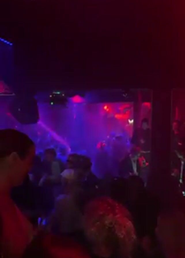 crowded nightclub with dark lighting and colorful strobe lights. People are milling around, some holding drinks. The music is loud, and the overall atmosphere is energetic and social. There is a VIP area raised up and to the right.