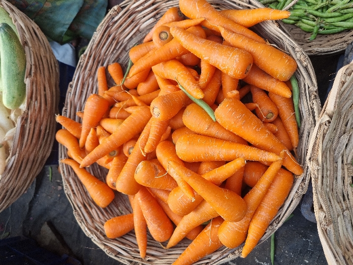 The image displays a close-up view of fresh produce in Enumulapalli, India. The central subject is a round, brown wicker basket overflowing with numerous unpeeled, vibrant orange carrots of varying sizes. The carrots are stacked densely within the basket, some exhibiting minor surface irregularities or adhering soil. In the upper background, a partial view of another wicker basket contains light-colored, elongated vegetables and a single green, cylindrical vegetable. To the bottom right, a segment of a third wicker basket is visible, filled with green, pod-shaped vegetables, likely green beans. The baskets are positioned on a dark, indeterminate surface, suggesting an outdoor market or vendor stall. No individuals, explicit actions, or interactions are present in the scene.