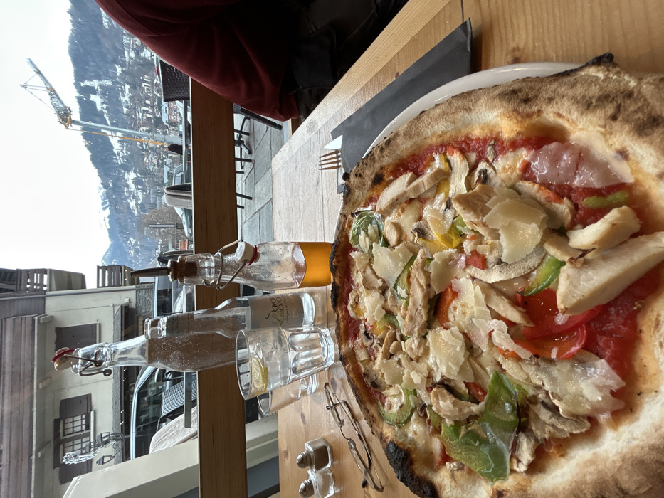 The image depicts an indoor dining scene at a restaurant in Saint-Gervais-les-Bains, France, with a prominent view of the surrounding town and mountainous landscape through a large window. In the foreground, a large, round pizza with a charred crust rests on a white plate on a light-colored wooden table. The pizza is topped with tomato sauce, melted cheese, sliced chicken breast, shaved Parmesan cheese, sliced mushrooms, diced red and green bell peppers, and fresh green basil leaves. To the left of the pizza, on the table, are two small glass salt and pepper shakers, a pair of wire-rimmed reading glasses, a tall swing-top glass bottle containing water, a smaller glass bottle labeled "Savoie Mont Blanc," and two clear drinking glasses, one containing water with a lemon slice. Further right, a small glass bottle with a pour spout contains amber-colored oil. A black folded napkin and a silver fork are positioned to the right of the pizza plate. Through the window, an outdoor patio with dark wicker furniture is visible. Beyond the patio, a street features parked vehicles, including a white SUV and a dark sedan. Architectural elements of multi-story buildings with wooden balconies are discernible across the street. In the mid-ground, a person wearing a dark red long-sleeved shirt and dark pants is partially visible, seated at the table to the right, facing away from the camera. The background reveals snow-covered mountains under an overcast sky, with a tall yellow and white construction crane prominently positioned on a distant slope.