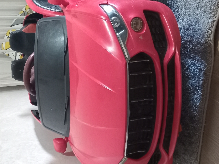 The scene is located indoors in Meknes, Morocco. A pink child's ride-on electric toy car is positioned facing forward, occupying the majority of the frame. The toy car features a prominent black vertical slat grille with a silver-colored trim, integrated headlights, and lower circular fog lights. A dark plastic windshield with small wiper blades is visible, along with a red steering wheel and two black bucket seats in the interior. A single red side mirror is present on the left. Minor scuff marks are visible on the front right bumper area near the fog light. The vehicle rests on a blue shaggy rug or mat, which covers a portion of a light wooden floor. A plain white textured wall forms the background on the left, while a light-colored patterned fabric or curtain is partially visible in the upper right background. No individuals or active interactions are present in the image.