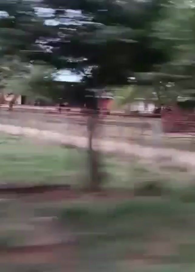 view from a moving vehicle, likely a car, driving past a grassy field with trees. A fence and a red building are visible in the background. The camera moves quickly, causing blurring, but the overall scene appears to be a rural or semi-rural landscape.