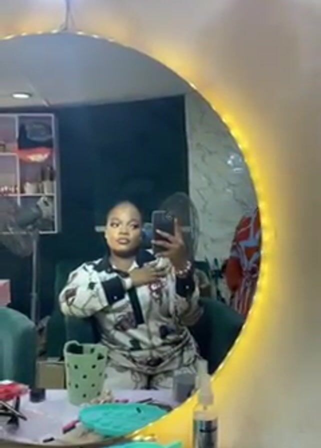 A woman sits in a green armchair, taking a mirror selfie with her phone. The round mirror is lit with lights around its edge, and the table in front of her is covered in makeup supplies. Behind her, there's a shelf with various items, a fan, and a person in a colorful outfit is partially visible. The room is well-lit with a large overhead light.