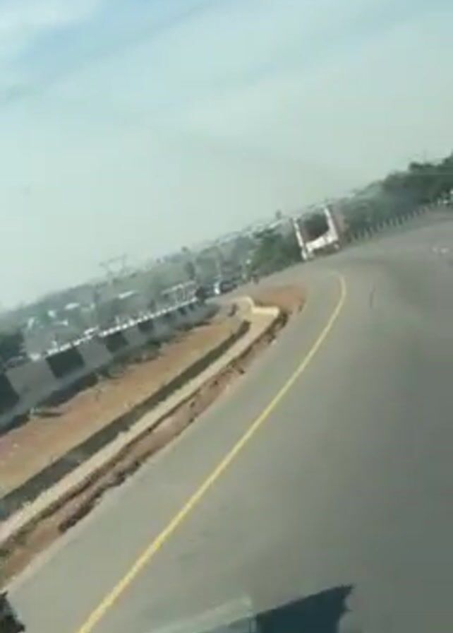 The video, filmed from a moving vehicle, shows a multi-lane highway curving to the right