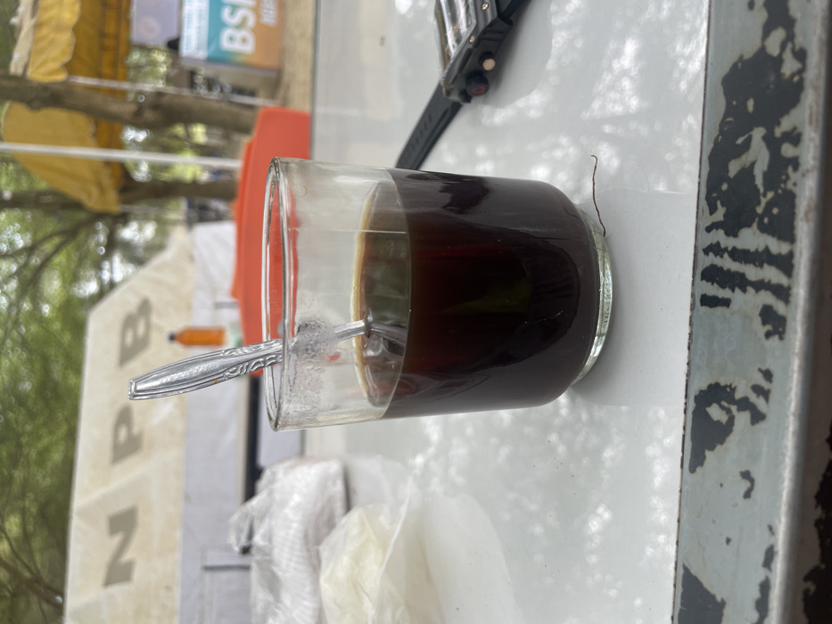 A glass of dark liquid, possibly coffee, sits on a white surface outdoors. A spoon rests inside the glass. Background elements include a partially visible white tent, an orange object, and trees. To the right of the glass is what appears to be a worn table edge. A watch is slightly visible on the upper right corner. A single strand of hair is near the right side of the glass.
