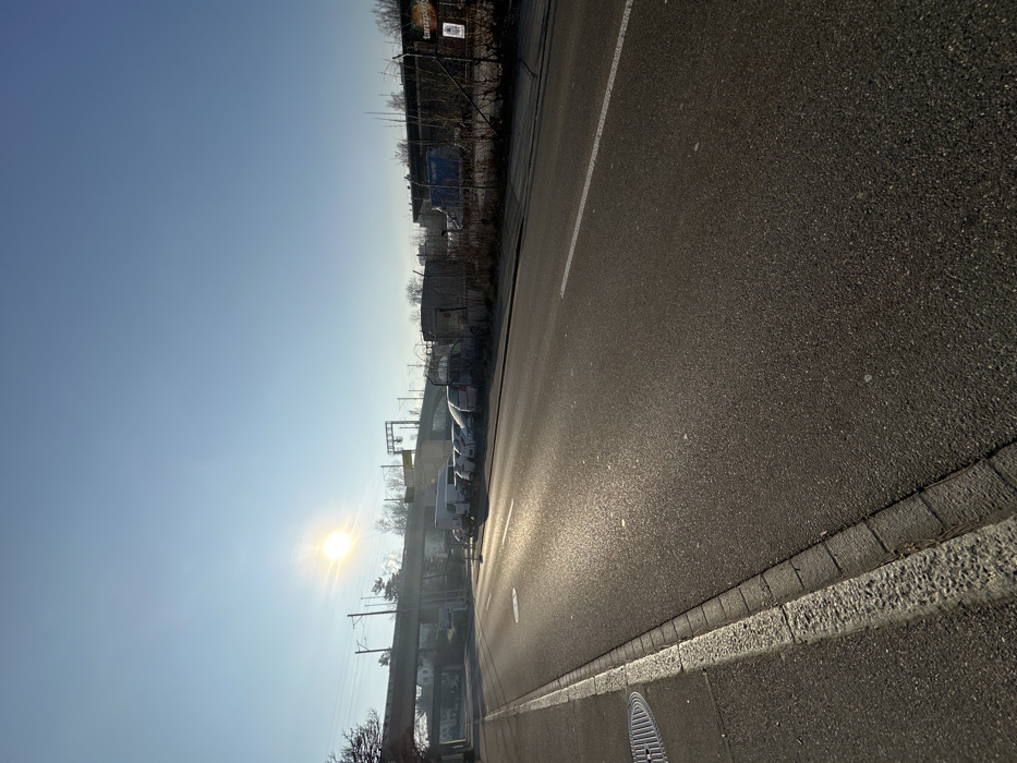The image depicts an exterior scene in Glattbrugg, Switzerland, under clear, sunny conditions, likely during morning or late afternoon, given the low sun angle and long shadows. The foreground features a dark grey asphalt road, sloped slightly upwards from the bottom left, with a single white lane marking on its right side. The road surface exhibits specular reflections from the sun, which is visible in the upper left quadrant, causing lens flare. A concrete curb and a paved sidewalk are present on the left edge of the road, with a circular manhole cover visible on the sidewalk in the bottom left. To the right of the road, an unpaved area contains approximately eight to ten parked vehicles, primarily passenger cars and vans, some appearing weathered or potentially abandoned. This lot is bordered by a chain-link fence, partially obscured by sparse, bare vegetation, which separates it from an adjacent commercial or industrial property. Within this property, several low-rise structures are visible, including one with a large blue tarp or covering, and a partially discernible sign displaying "TANZP..." text. A prominent concrete railway overpass or bridge spans horizontally across the mid-ground, carrying multiple railway tracks and overhead catenary lines. The road passes beneath this bridge, forming an underpass. Beyond the bridge, more railway infrastructure and bare trees are visible, with faint outlines of buildings in the distant background on the left. No individuals or active vehicles are present in the scene.